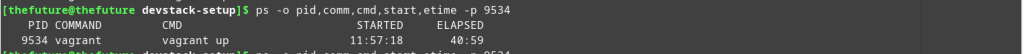 If I need to see how long it has been running, I’d have to open a new terminal window then get the process ID it has, I’lltype in ps aux | grep "vagrant up" to see which ID the process has.