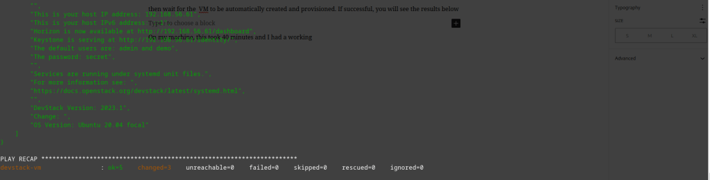 The steps done are really simple as you can see above. Once, the VM has been created, Devstack is cloned from Opendev . The backend is copied from the local.conf file and then stack.sh is executed while its output is waited upon to see if there is any error.